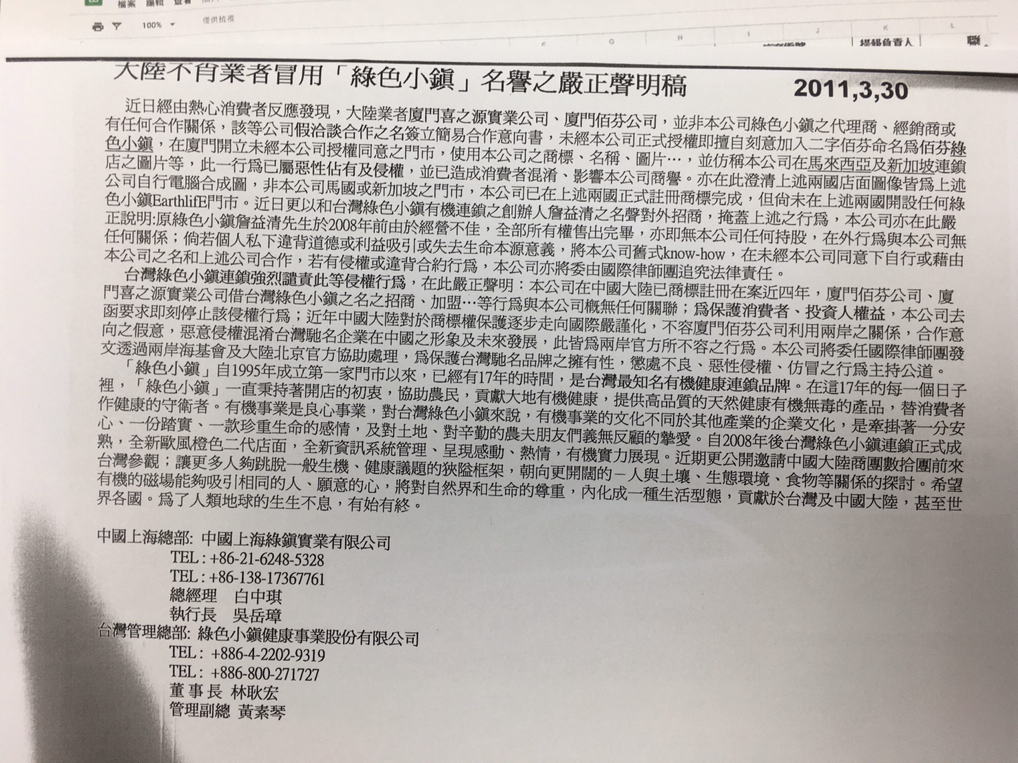 綠色小鎮』有機連鎖門市於2010年8月在廈門對外營運外,並大量盜用台灣綠色小鎮的資料對外行銷加盟經營,企圖以台灣綠色小鎮之品牌、經驗及知名度誘引並混淆中國消費者及加盟者視聽,獲取不當利益!該案經台灣綠色小鎮於100年初知悉,便積極透過搜證『佰芬 綠色小鎮』侵害商標等事實確鑿後,隨即於100.03.30發聲聲明稿澄清,足以證明台灣綠色小鎮於99-100年間在中國已具品牌知名度!雙方事後採取合作取代對簿公堂,而台灣綠色小鎮於101年間陸續中國上海設立北外灘店、陸家嘴店及徐匯店等3家門市,順利的化解品牌危機。