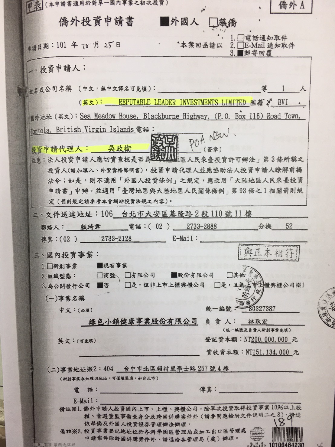 萬萬想不到吳政衛竟大玩兩面手法,檯面上是R公司代理人與綠色小鎮談入資合作,檯面下以自己吳政衞私人名字成立: